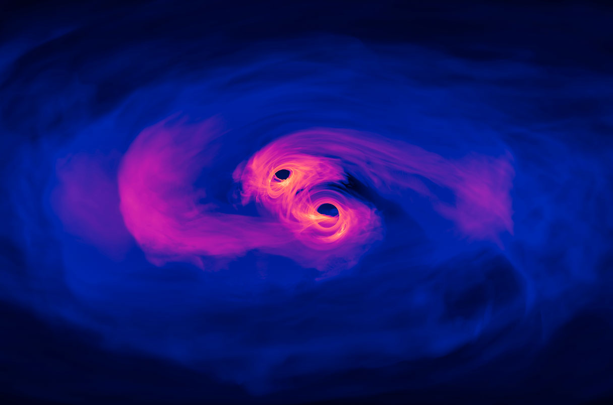 과학자들은 서로의 궤도를 돌고 있는 두 블랙홀이 이러한 신호를 방출하고 있는 것으로 결론내렸습니다.