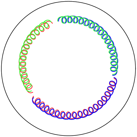 이처럼 쿼크와 글루온은 고유의 색을 가지고 있으며, 서로 반대되는 색 끼리 연결되죠.