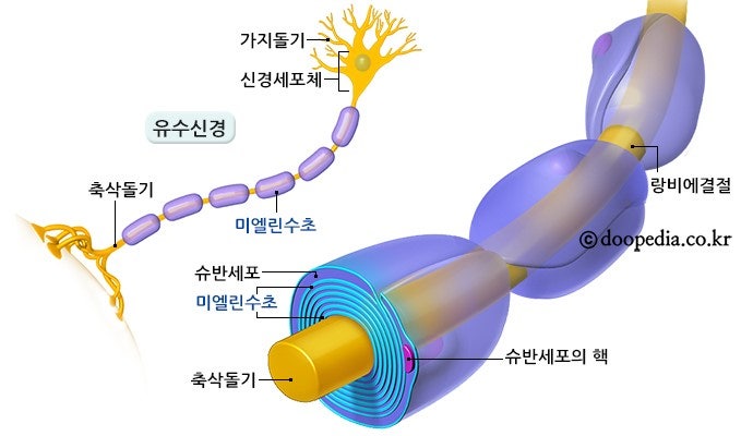'미엘린 초'는, 뉴런의 축삭을 감싸서 보호해주고 있는 일종의 보호막입니다.