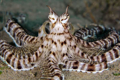 몸길이가 5cm에 불과한 이 문어는 피부의 미세한 돌기를 이용해 마치 털이 난 것처럼 위장합니다.