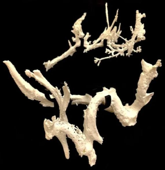 혈관이 있던 자리에 철분이 풍부한 광물이 스며들어 그 형태를 그대로 본뜬 '틀'처럼 굳어진 것이죠.