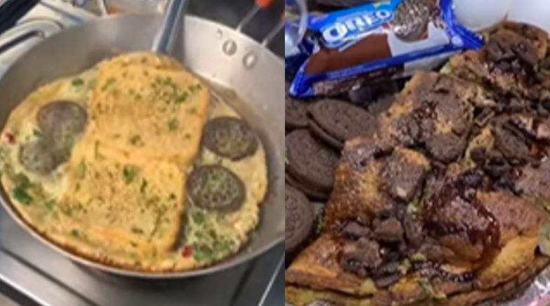 그는 계란을 풀고, 그 안에 콜라를 붓고, 오레오 쿠키를 부숴 넣은 뒤 오믈렛을 만듭니다.