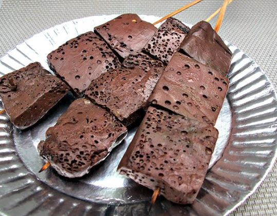 닭이나 돼지의 피를 받아 식히면 선지처럼 굳어지는데, 이것을 비디오테이프처럼 네모난 큐브 모양으로 잘라 꼬치에 꿰어 숯불에 구워 먹는 음식이죠.