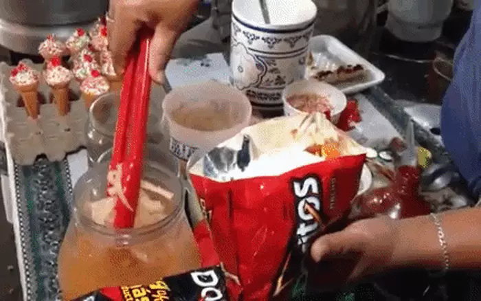 과자 봉지를 뜯어 그 안에, 잘게 썬 채소, 돼지 껍데기 절임, 핫소스, 땅콩, 그리고...