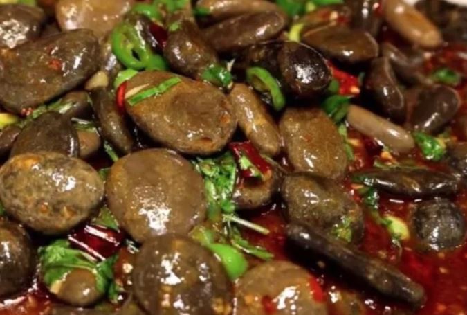 손님들은 이 요리를 받은 뒤, 돌멩이를 입에 넣고 쪽쪽 빨아 양념 맛만 즐긴 뒤, 돌멩이는 뱉어냅니다.