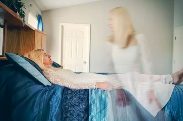 극심한 고통 속에서, 그녀는 갑자기 자신의 존재(의식)가 병실 구석 천장에 떠서, 침대 위에 누워있는 자기 자신을 내려다보고 있음을 깨달았습니다.