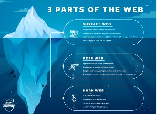 구글 등 일반 검색으로 접근 가능한 '표면 웹(Surface Web)', 검색되지 않는 '딥 웹(Deep Web)', 그리고 딥 웹 중에서도 특수 브라우저(Tor 등)로만 접속 가능하며 불법 활동의 온상이 되는 '다크 웹(Dark Web)'입니다.