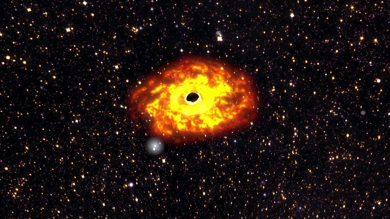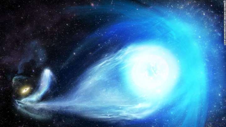 먼 옛날 이 블랙홀 근처에 한 쌍성이 접근하게 되었고, 블랙홀은 썽성 중 하나의 별을 바깥으로 날려버렸습니다.