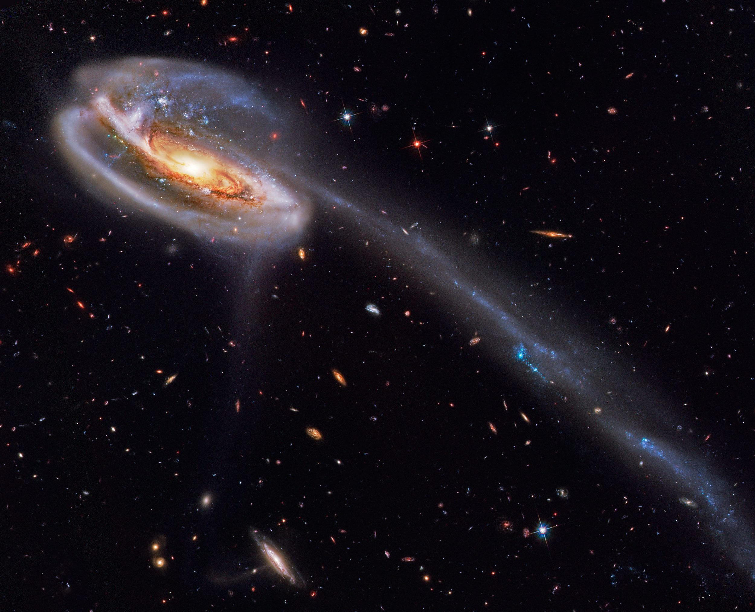 이 "올챙이" 은하의 꼬리는 약 500,000광년으로, 우리 은하보다 5배나 더 길죠.