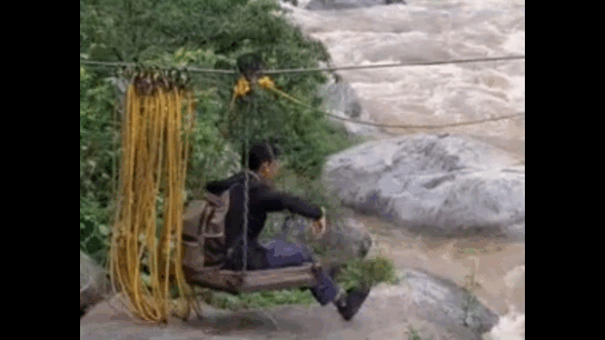 동영상에서 볼 수 있듯이, 이 마을의 아이들은 매일 아침 도르레에 매달려 계곡을 건너고 있습니다.