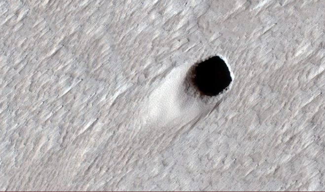 바로 화성의 표면에서 엄청나게 거대한 용암 동굴의 입구를 발견한 겁니다.