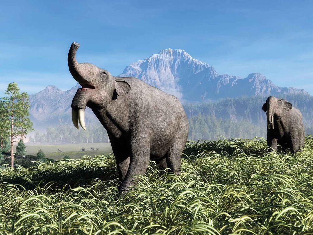 약 2천만 년 전에 살았던 데이노테리움은 턱 부분에 아래쪽으로 구부러진 두개의 엄니를 가지고 있었죠.