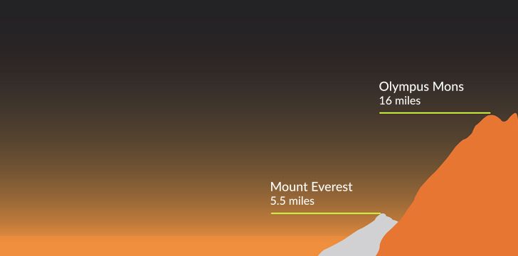 화성에 있는 올림푸스 몬스 산의 높이는 25km로 에레레스트 산보다 약 3배 더 높습니다.