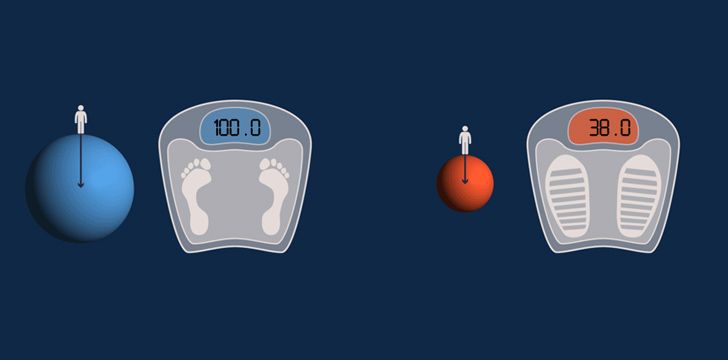 12. 몸무게 100kg의 사람은 화성에서 38kg이 됩니다.