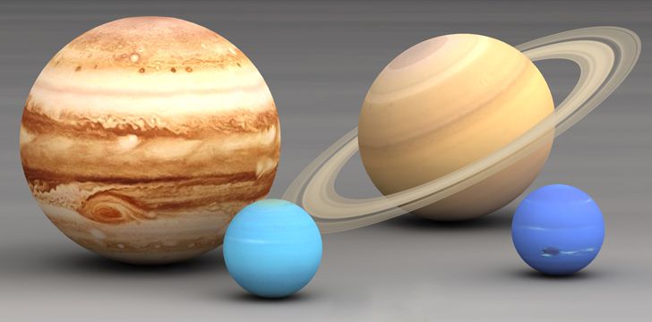 목성, 토성, 천왕성, 해왕성과 같은 가스 행성들은 주로 수소와 헬륨 등으로 구성되어 있으며, 크기 대비 아주 작은 암석 코어를 가지고 있습니다.