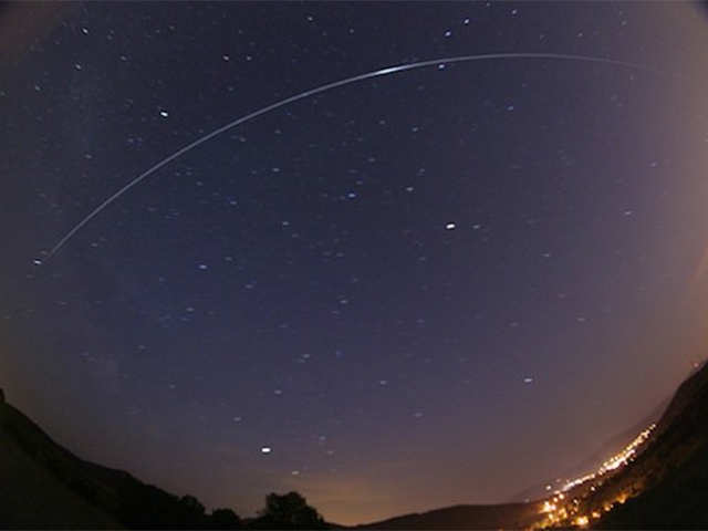 밤 하늘에서 국제 우주 정거장은 마치 수평선에서 수평선으로 빠르게 움직이는 별처럼 보입니다.